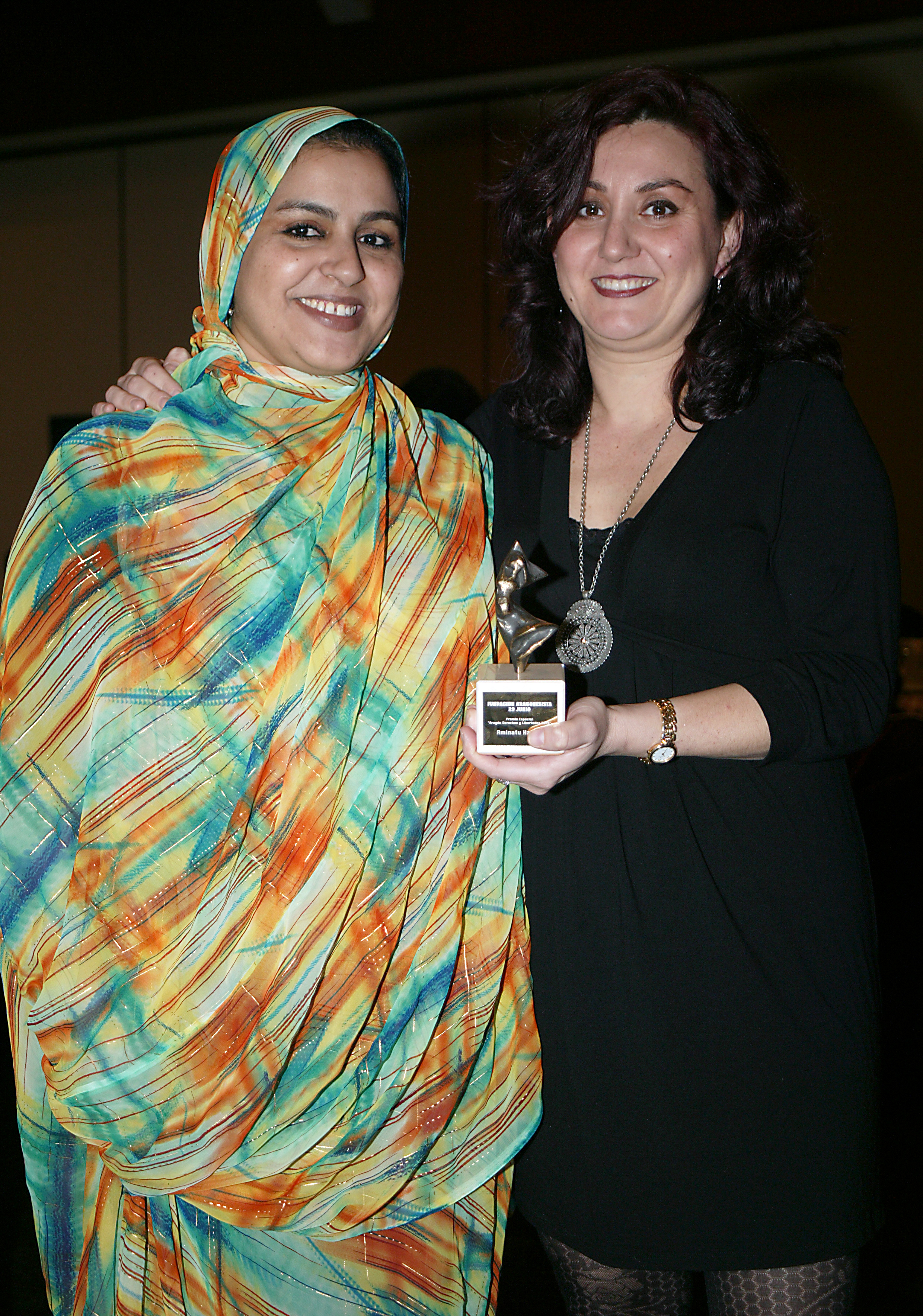 Aminatu Haidar Según algunas fuentes nacida en Akka Centre, provincia de Tata, Marruecos, 24 de julio de 1966, según otras nacida en El Aaiún (por entoncesm Sahara español) en 1967 es una activista pro saharaui y de los Derechos Humanos.Debido a su ideología pro saharaui, ha sido perseguida y reprimida por los poderes públicos marroquíes en numerosas ocasiones. En 1987, con 21 años, formó parte de una manifestación pacífica formada por 700 participantes que exigían el referéndum de independencia del Sahara frente a Marruecos. Tras estas actividades fue presa sin cargos ni juicio en las conocidas como «cárceles secretas» durante 4 años.3 Allí, sufrió torturas junto a otras 9 mujeres y 50 hombres, saharauis presos. En 2005 fue condenada por la justicia marroquí a la estancia de 7 meses en el centro penitenciario conocido como «Prisión Negra» de El Aaiún. El proceso del juicio debido a irregularidades, fue denunciado por un observador enviado al efecto por Amnistía Internacional. También miembros del Parlamento Europeo emprendieron una campaña internacional por la liberación de Aminetu Haidar, la cual se exigió formalmente mediante resolución de dicho parlamento. Tras más de un mes en prisión, fue liberada en enero de 2006. Su puesta en libertad reavivó las revindicaciones de independencia de los saharauis, que se manifestaron en las calles de El Aaiún y protestas de los estudiantes saharauis de la Universidad de Marrakech. Tras la gran dimensión mediática de su irregular aprisionamiento, y el importante apoyo que obtuvo por asociaciones y políticos occidentales lograron la expatriación de Haidar con el fin de erigirse en embajadora itinerante de la República Árabe Saharaui Democrática en contacto con gobiernos extranjeros y asociaciones pro saharauis. En agosto de 2006 Marruecos le denegó el pasaporte y el derecho de expatriación de sus dos hijos como medida de presión. Por su lucha por el reconocimiento de los derechos de los saharauis ha sido galardonada con diferentes reconocimientos internacionales, tales como: