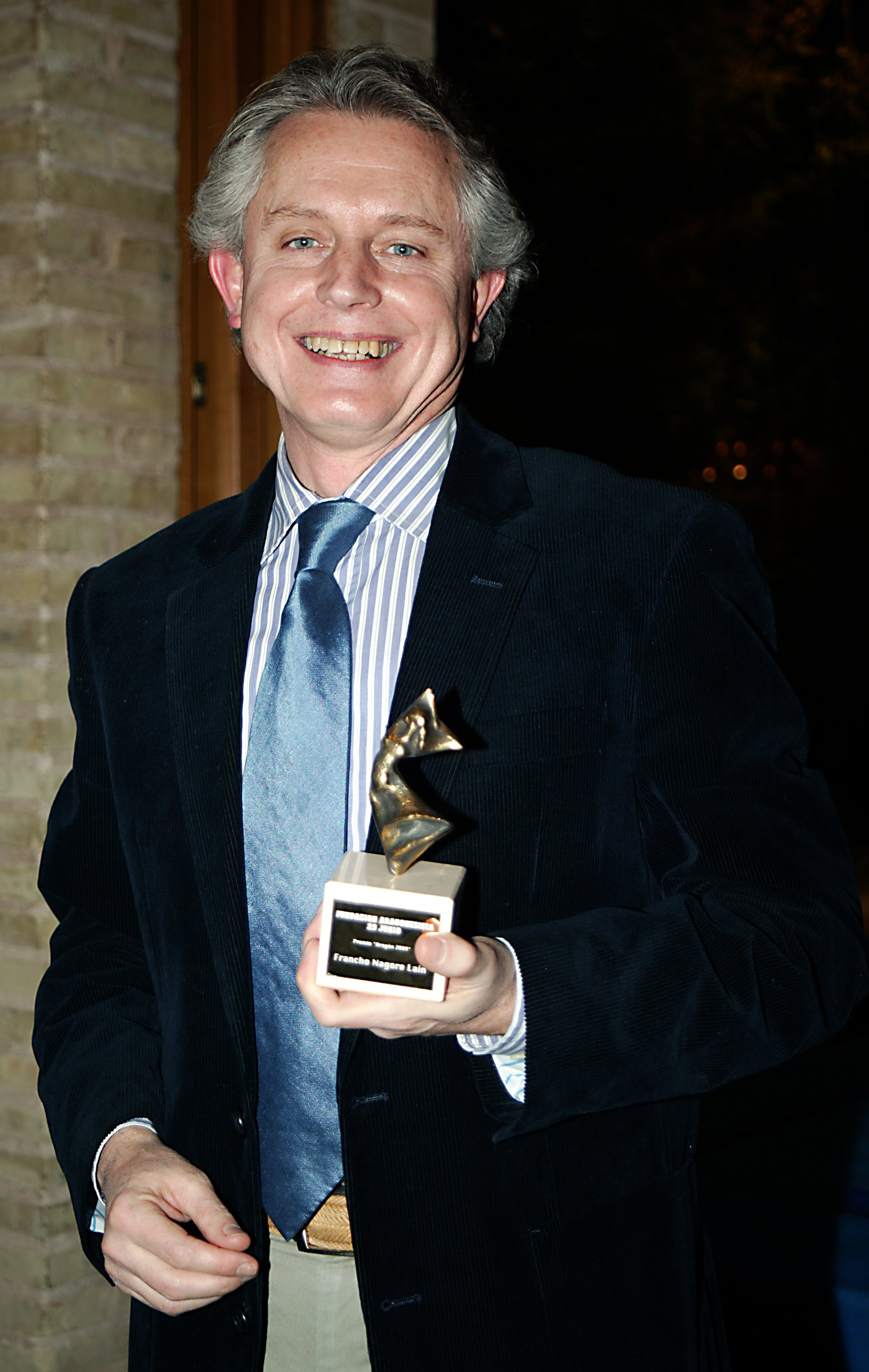 Francho Nagore Laín Filólogo, profesor en la Universidad de Zaragoza y autor en idioma aragonés. Como filólogo es en parte responsable del renacimiento del aragonés como lengua propia en época moderna. Es el director del Diploma de Especialización en Filología Aragonesa del Campus de Huesca (Universidad de Zaragoza). Durante la dictadura de Franco, existía una tendencia a considerar la lengua aragonesa como un dialecto rural y tosco del castellano, sin personalidad propia. Nagore realizaró una tesis sobre el pandicuto (dialecto de la lengua aragonesa propio de Panticosa y el Valle de Tena) en la que concluyó que existía una lengua diferenciada del castellano en el Alto Aragón, el aragonés, con grandes similitudes gramaticales entre los diferentes dialectos que quedan diseminados en el territorio altoaragonés. Su tesis doctoral versó sobre la «Crónica de San Juan de la Peña» («Coronica de San Chuan d’a Peña»), una de las principales obras en aragonés del siglo XIV, publicado en 2003. Ha publicado diferentes estudios sobre el aragonés (gramática, dialectología, sociolingüística, aragonés medieval etc.); en 1977 publicó la primera gramática del aragonés; años después los libros A bida, a obra y a fabla de Cleto Torrodellas (1981), El aragonés de Panticosa: Gramática (1986), Replega de testos en aragonés dialeutal de o sieglo XX (1987), Fuens lesicograficas de l’Aragonés. Catálogo de repertorios lesicograficos aragoneses dende o sieglo XVII dica 1998 (1998), Los territorios lingüísticos en Aragón (2001), o El aragonés en el siglo XIV (2003), entre otros. Como escritor en lengua aragonesa deben citarse los libros de poesía Sospiros de l’aire (1971), Cutiano agüerro (1977), Purnas en a zenisa (1984) y Baxo a molsa (1999). Nagore es vicedirector del Instituto de Estudios Altoaragoneses y vicepresidente de la AIDLCM (Association Internationale pour la Défense des Langues et des Cultures Menacées). En el año 2005 recibió la medalla de oro de Santa Isabel de Portugal de la Diputación Provincial de Zaragoza como reconocimiento a su trabajo por Aragón. Es, asimismo, uno de los fundadores del Consello d’a Fabla Aragonesa, asociación de carácter cultural, de la que ha sido presidente desde 1978 hasta el año 2004. También presidió el primer congreso para la normalización del aragonés, organizado por el Consello y otras asociaciones en 1987, en el que se consensuaron y aprobaron unas normas ortográficas de uso en todas las variedades del aragonés.